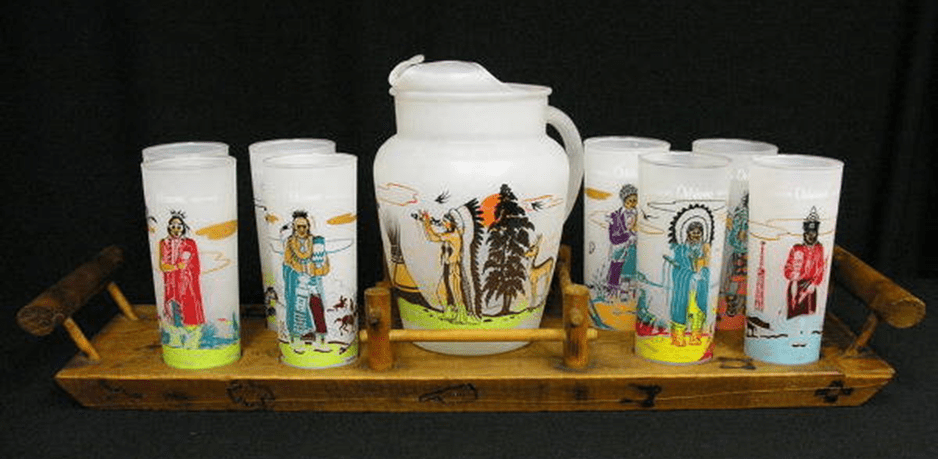 One of our prized possessions is this drink set that he made for Knox Industries. Before my time, certain manufacturers gave promotional items to entice customers to purchase their products, such as serving bowls in boxes of laundry detergent. Acee Blue Eagle’s paintings were used on this set of pitcher, glasses, and tray were gifts with a 10-gallon purchase of gasoline. Somewhere out there are matching dinner dishes.
