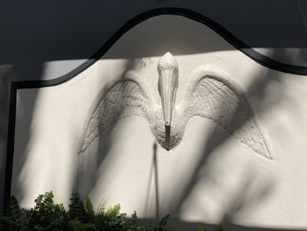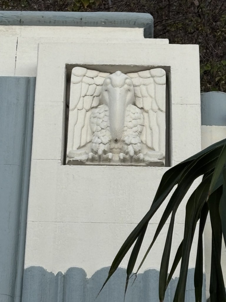 The pelicans. I love the pelicans (see 6-2-2020 and 5-11-2023 blogs). They are such ungainly birds, and yet when you catch a group in the sky they seem to just sit and drift elegantly suspended on the air until suddenly one takes a nose dive straight down seeking a morsel that caught its eye. Here are three that have been incorporated into the Art Deco architecture. First, one soaring above the entrance to the original Miami Beach Library, now the Bass Museum, and the last along the side of the famous Friedman’s Bakery on Washington Avenue. I was this one one afternoon when Constant Companion and I did some exploring.