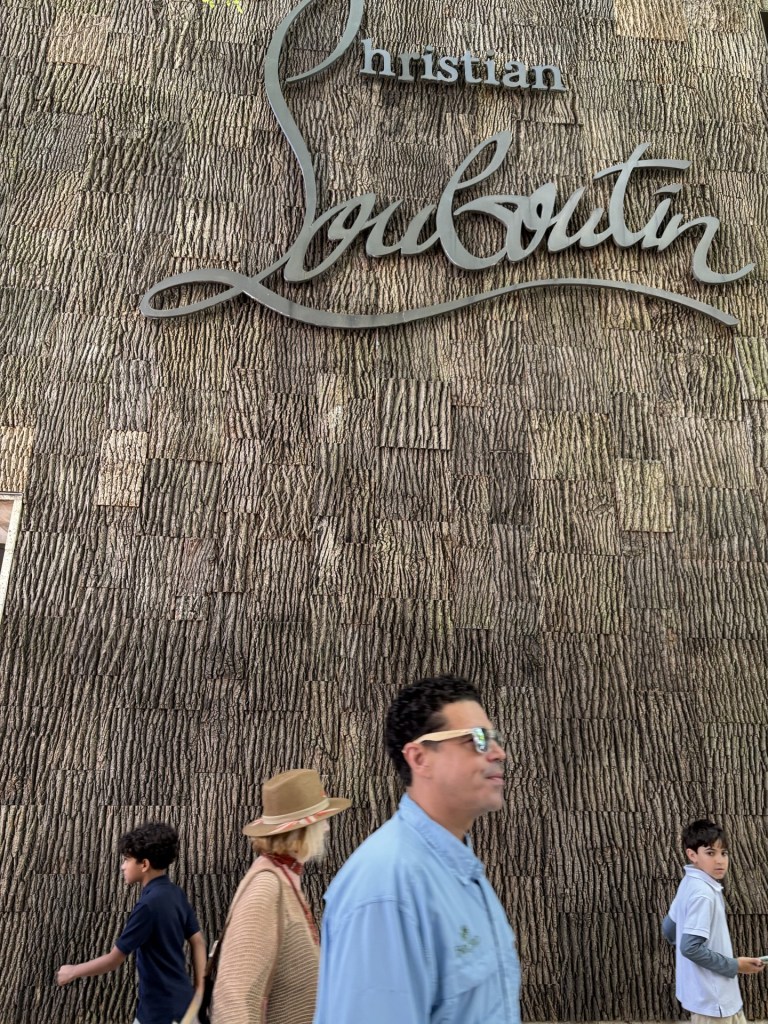 The Christian Louboutin store, known for their red soles, creatively used bark probably from oak trees to face the exterior walls of the building.