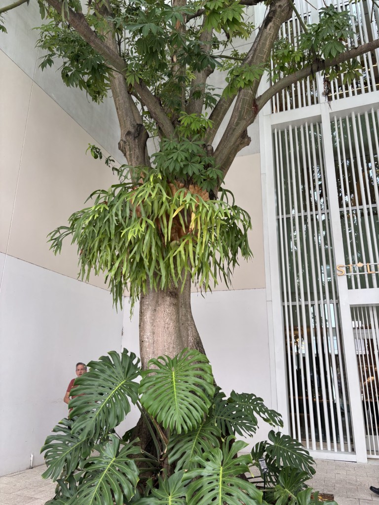 Another Guiana Chestnut that was brought to the District from a local yard was pointed out. The homeowner wanted to remove the tree that grew much taller than expected. It has a new life here, covered with staghorn ferna and monstera below. Another orchid variety, vanilla, climbing the limbs of the tree is difficult to see.