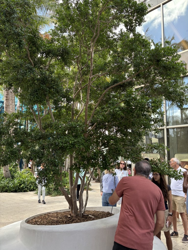 Over five hundred trees have been planted in the sixteen blocks of the Design District, most moved here as mature trees. Including the understory, over one hundred species have been installed. It was pointed out that the pavings are not concreted in; underneath the walkways is a mixture of soils and pea rock to accomdate the growing root systems of all of the trees and plants. In addition, along the paseos and in the plazas, the plantings are planned to coordinate with the abundant public art.