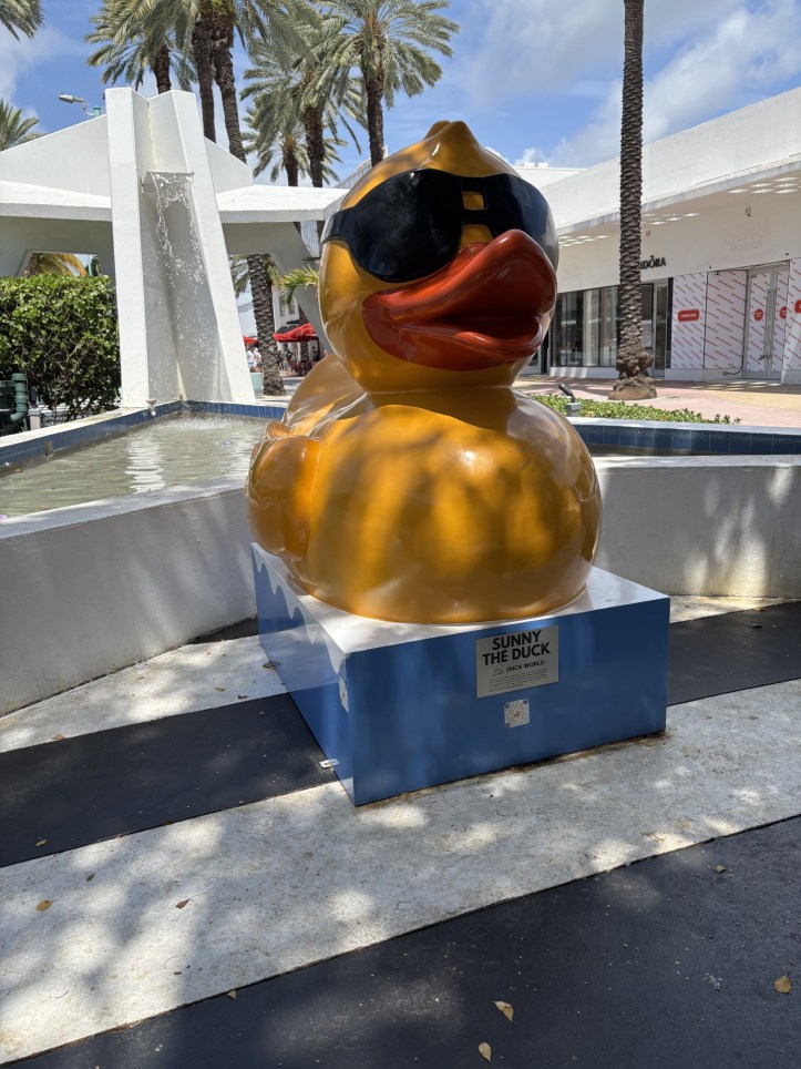 “Sunny the Duck,” a seven foot tall solid rubber duck, is another Lincoln Road duck-themed sculpture. Sunny is sponsored by Duck World which recently opened their flagship U.S. store on neighboring Washington Avenue. Other locations of Duck World can be found elsewhere in the US and the UK.
