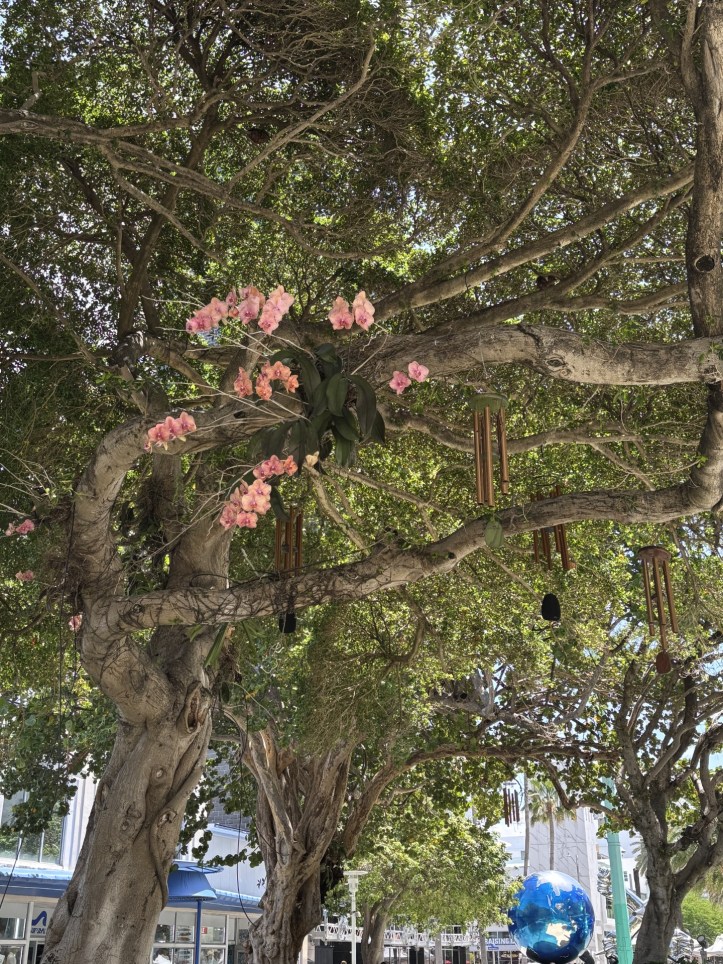 There’s so much more to take in on any day on Lincoln. I saw only one of the chimes installed in the canopy last fall (see 11-23-24 post). On a West Indian Laurel fig it was accompanied by a beautifully blooming orchid, part of Fairchild Tropical Garden’s million orchid project (https://fairchildgarden.org/science-and-education/science/million-orchid-project/).