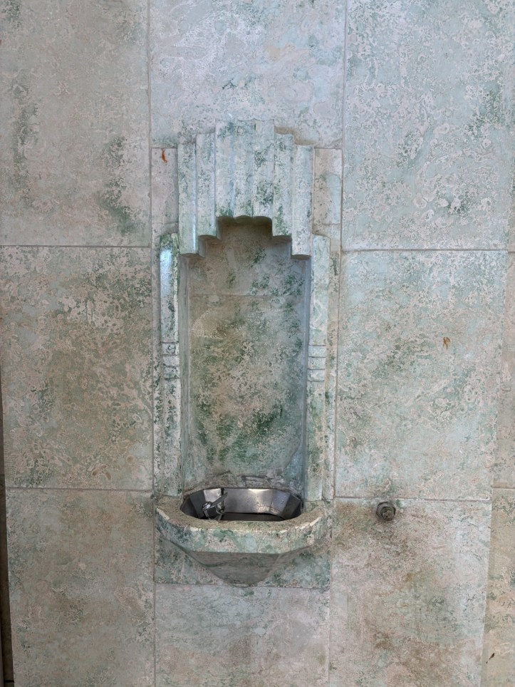 I enjoy exploring the shops on Lincoln to find vestiges of the original architecture and history of this “Fifth Avenue of the South.” On my stroll I went to see what I remembered seeing on a previous walk. Lincoln Road had been the home of at least four movie theaters. The Carib and the Beach are long closed as is the iconic Lincoln Theater. The latter has been lovingly restored and made the home of the New World Symphony for many years before their move to their own Frank Gehry building nearby. It now houses a two-story H & M store. Remains of the old building are still found in the building like this water fountain.