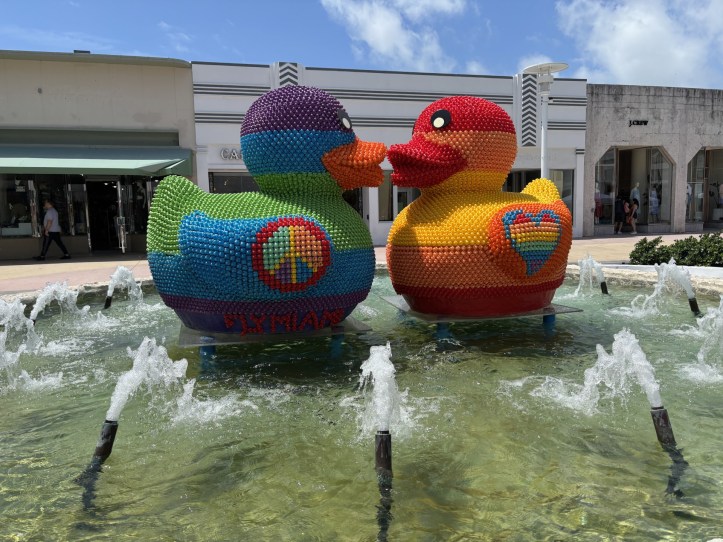 Two other new sculptures united by the themes of Pride and ducks were installed on Lincoln early in April as part of the Road’s annual celebration of Miami Beach Pride Month. “Unity Beak” is two multi-colored, larger-than-life ducks inhabiting one of the iconic fountains, part of the streetscape created by Morris Lapidus.
