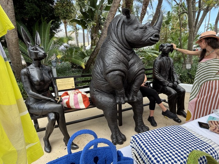 In “The Giraffe and Chimpanzee,” they ride with a playful chimpanzee on the back of a tall giraffe on bicycle built for four. In another location, the friends join a white rhino on “The White Rhino Bench of Friendship,” a bronze bench with room for more. Both works are designed for visitors to sit and take photos.