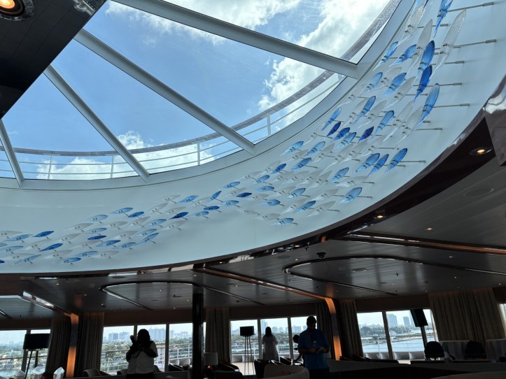 We slowly descended the elliptical double-helix staircase deigned by Adam Tihany connecting deck 4 to deck 10 in the middle of the ship’s Atrium. The late Murano-born sculptor Luciano Vistosi‘s crystal work, Warrior the Second, is a central part of the Atrium.