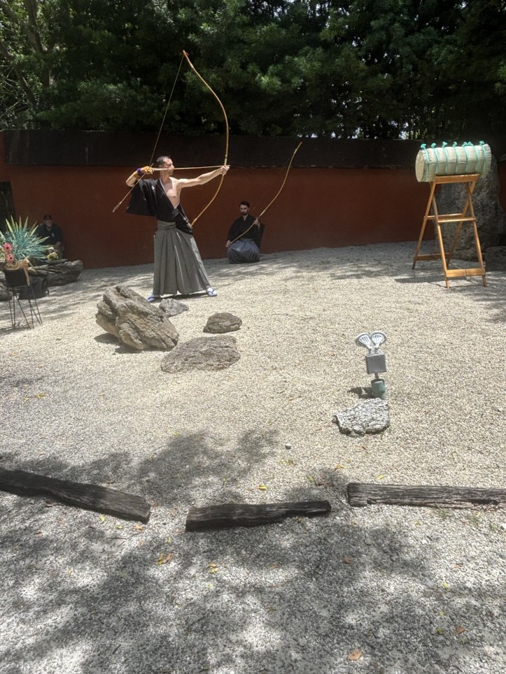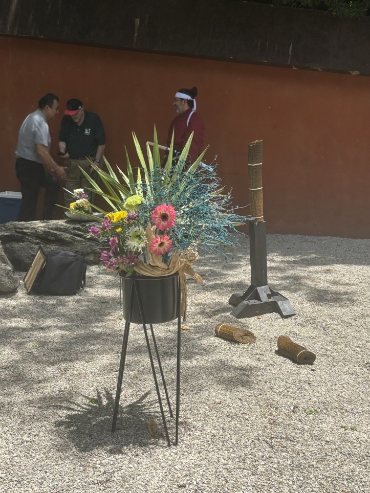 Our hosts showed us a beautiful example of Ikebana, flower arranging ready when we arrived. We were treated to two demonstrations. First was the South Florida Kyudo Kai or Way of the bow and Ceremonial shooting. We watched the meticulous steps taken in the practice of shooting the Japanese bow.