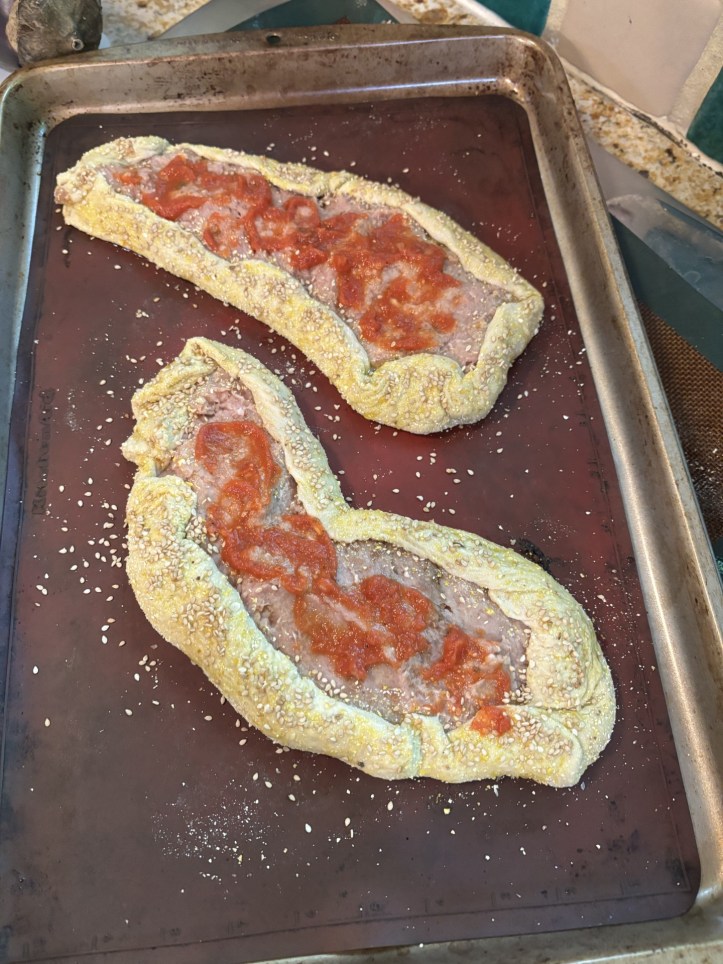 Preheat the oven to 450 degrees F. Lightly dusty your work surface; again I used cornmeal. I divided the dough into 2 balls and did my best to roll them into ovals. Transfer to a rimmed baking sheet. Let stand in a warm place covered with plastic or a clean kitchen towel until doubles, about 30 minutes.* Divide the meat and add half of it to each prepared dough oval, leaving a small margin on the edges. Fold edges over the meat; pinch ends together. Martha had tomato sauce in her meat; I brushed some pasta sauce on top of both pides. Brush crust with olive oil, sprinkle with toasted sesame seeds. Bake until golden, about 18 minutes.