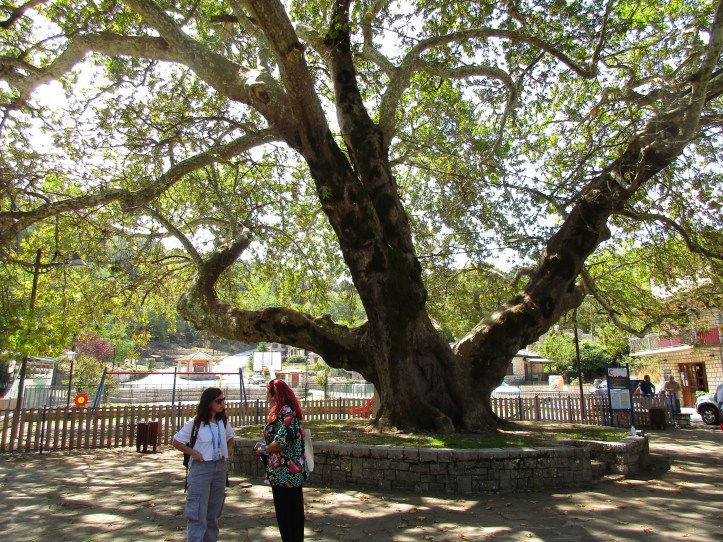 As we approached our first village stop, our guide informed us that each Greek village square (plateia) has three key elements: the central plane tree, the well, and the church. This village’s tree spread magnificently over the plaza.