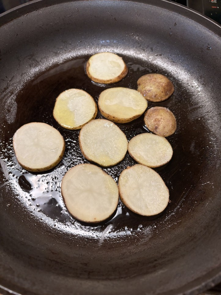 Pour another 1 Tbsp. oil into the skillet, heat at medium-high. Add one medium russet potato sliced in ¼” rounds in a single layer and season with salt. Cook, turning halfway through, until golden brown, 10–12 minutes.