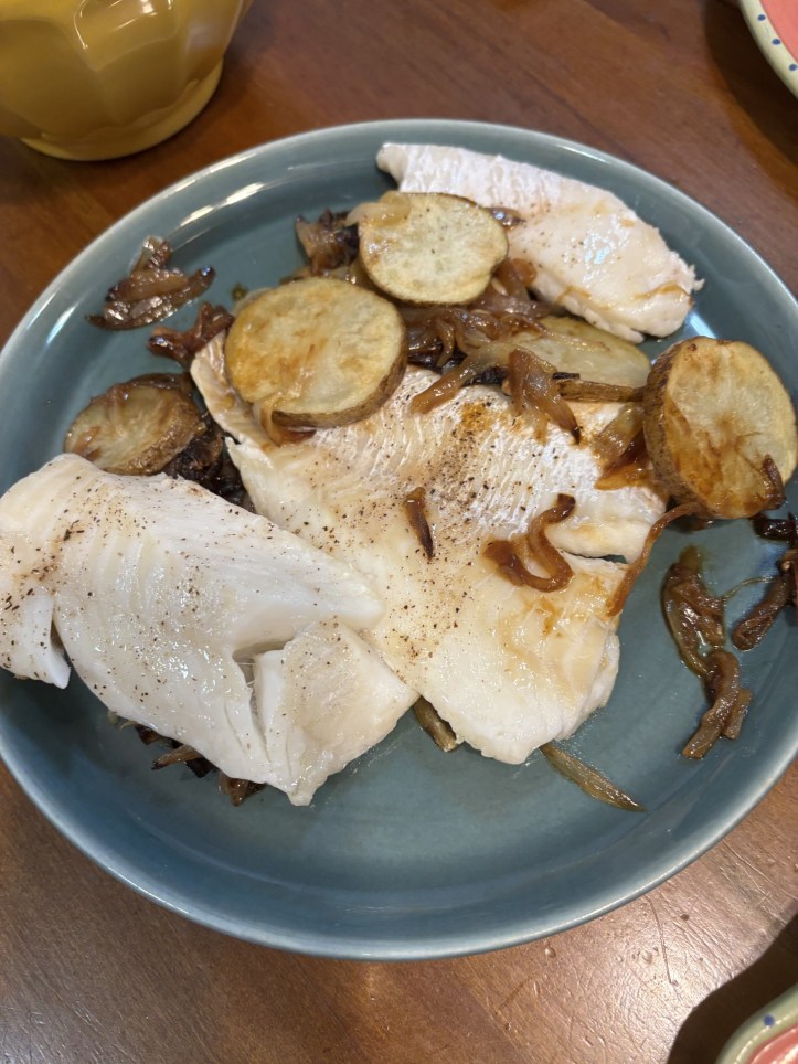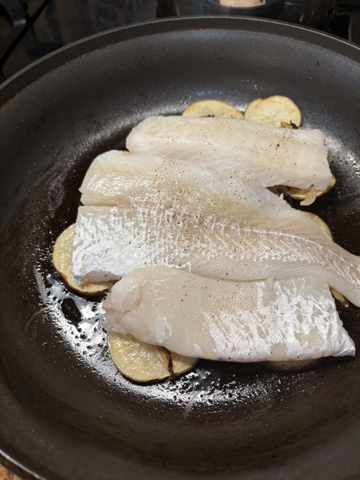 Spread onion mixture over potatoes, leaving a 1″ border of potatoes without onion mixture. Season 5-6 ounces of cod, or any flaky white fish with salt and place on top of onion mixture. Cover and reduce heat to medium-low.