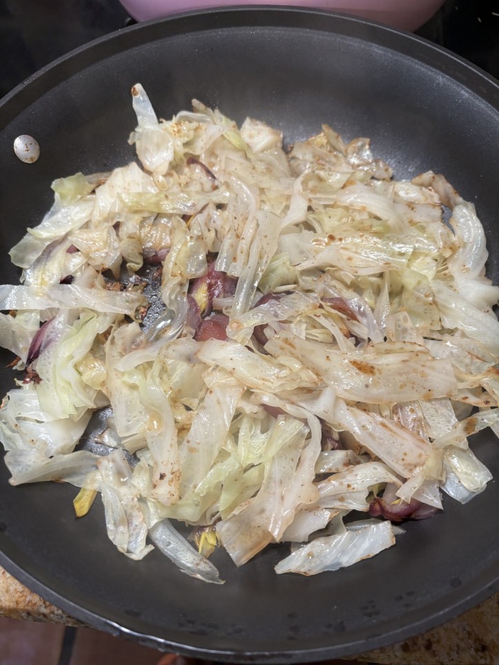 Cabbage. This was the night for improvisation. I sliced about a quarter head of cabbage waiting to be used. I put this into another skillet with a few tablespoons of olive oil. I used about one teaspoons of our local company Badia’s* black garlic seasoning. Cooked on low til the cabbage was thoroughly wilted.
