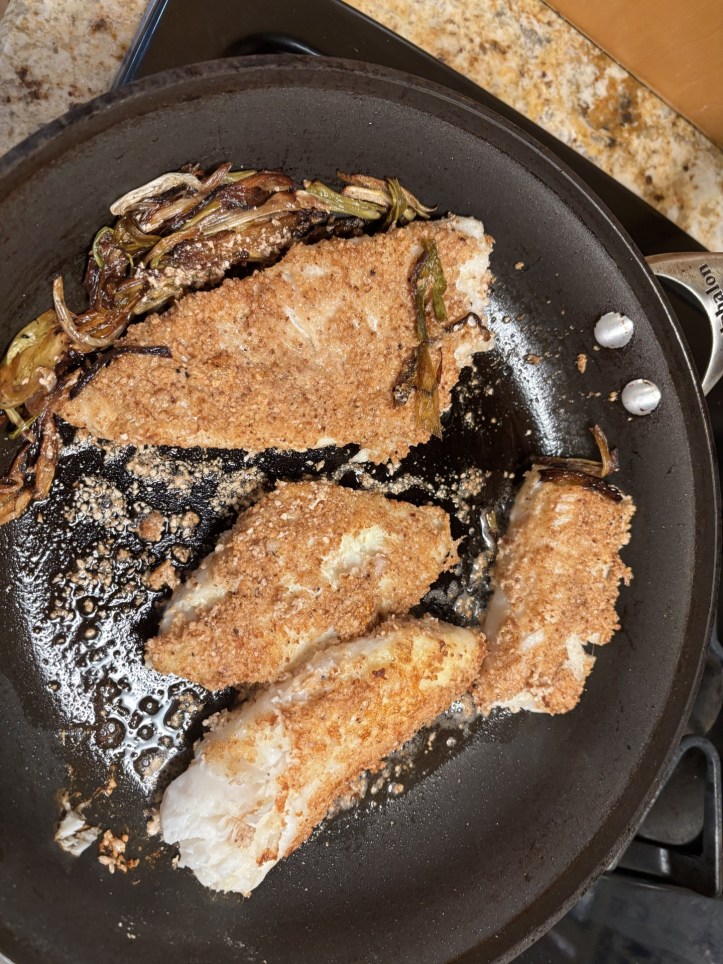 Cod. This was from the freezer, two nice fillets of so-called wild-caught cod. Lately I’ve been feeling that this fish was tasting a bit water-logged. I thought I’d improvise and try something different. I breaded the fish – not a usual technique for me, but easy.