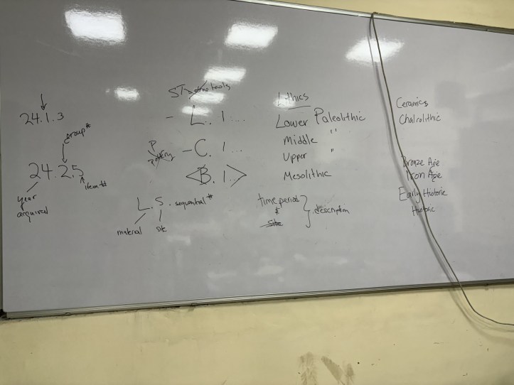 My students built a similar tripartite skeleton to establish a method that could be appropriate for this archeology collection and replicable. Their three-part number consisted of: 1-material (Lithic, Ceramic); 2 – site; 3 – sequential number. Then they set about measuring, putting numbers on the items, and creating catalog records.