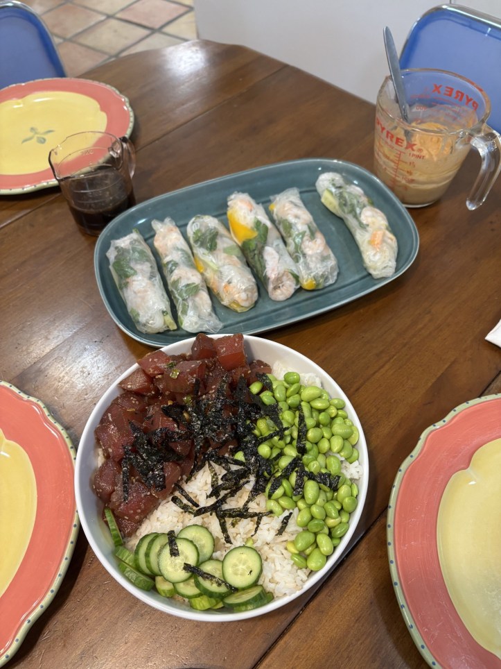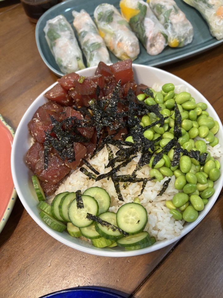 A recipe for tuna poke crossed my desktop a little while ago. Then at Ross Dress for Less, of all places, I picked up a package of spring roll wrappers. I had all necessary ingredients in the fridge and pantry and thought I’d try them both for dinner. Quite truthfully, while I enjoy playing with cooking some sort of Asian-style foods, poke and spring rolls were far from my usual culinary adventures. I thought take the challenge and give them a try.