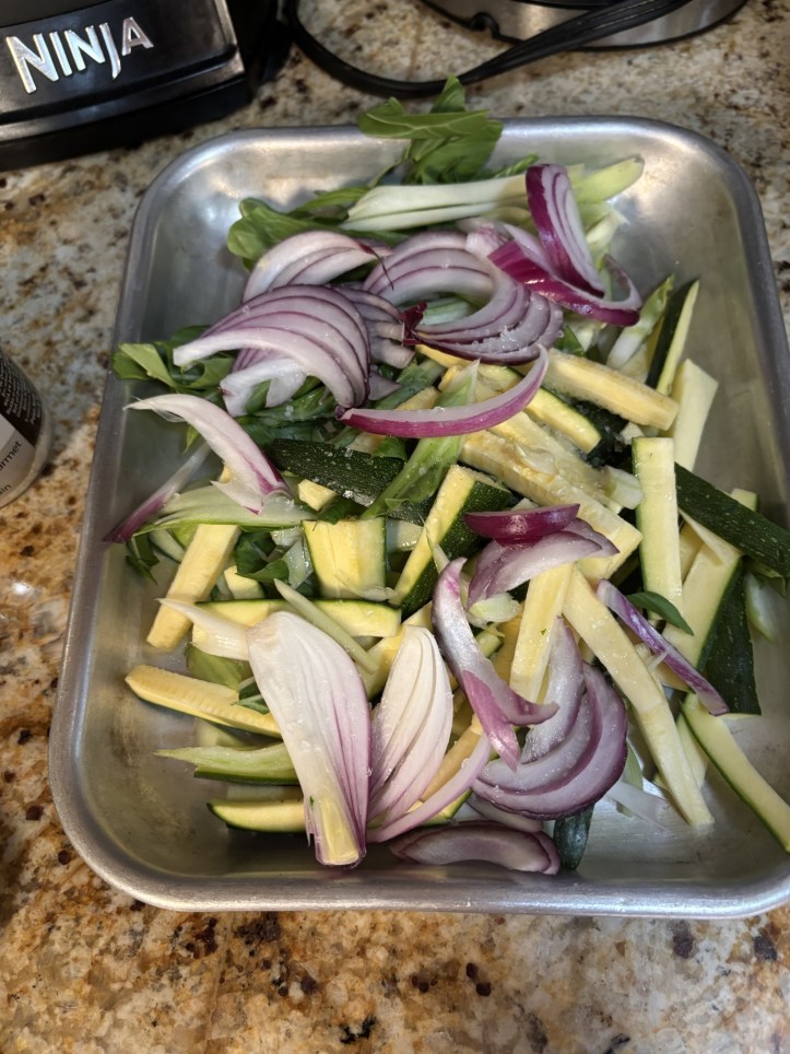Zucchini/Bok Choy Pancake. Actually, I combined several pancake recipes for this dish that the family enjoys. Julienne one small zucchini. Thinly slice two baby bok choys and ¼ red onion. Gently saute the vegetables.