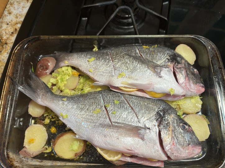 Whole roast sea bream with potatoes. Preheat the oven to 420 degrees F. Boil 6-8 small potatoes about 20 minutes til soft. Cut the potatoes into thick slices and cool; then toss with one chopped garlic clove, a handful of kalamata olives (I omitted this ingredient), olive oil, lemon zest, and salt and pepper. Spread in a nice-sized baking pan.