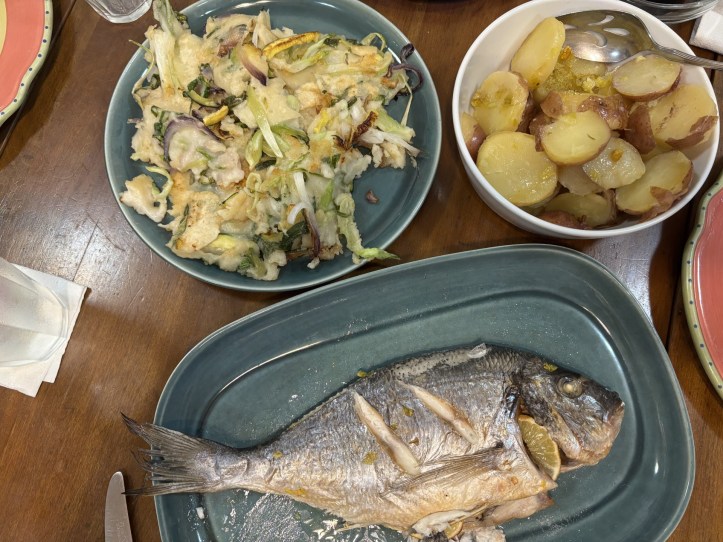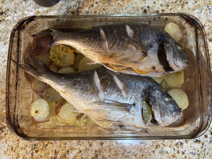 While in the great halls of Costco, I picked up a nice fish to make the annual birthday dinner for his truly! Sea bream was something different our usual branzino. Once home and rested from the unexpected excitement of the morning, I turned to my friend Google to seek directions for sea bream and found that is the fish is known as tsipoura in Greece .