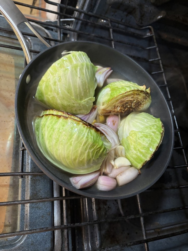 Melted Green Cabbage, Adeena Sussman. Preheat the oven to 300°F. In a heavy, large, high-sided skillet or shallow Dutch oven, heat the olive oil over medium-high heat. Sprinkle 1 teaspoon of the salt and ¼ teaspoon of the pepper directly onto the oil, then arrange 2 small heads of green cabbage (2 pounds), quartered (but not cored) cut in wedges in the pot, making sure that each is lying on a flat side (cram them in; they’ll relax into one another as they release liquid). Let the undersides get nice and brown, resisting the urge to move them too much but checking once to make sure they’re not burning (reduce the heat slightly if they are), 6 to 7 minutes. Using tongs, flip the cabbage wedges, then tuck the ten garlic cloves and four peeled and halved shallots into the pot, and brown the undersides of the cabbage, another 6 to 7 minutes.