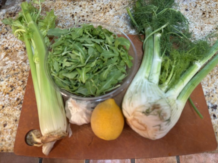 For the salad, cut one small fennel head in half, thinly slice (use chopped fronds for garnish). Toss with 2 cups arugula, ½ cored and julienned Granny Smith apple, ½ cup toasted and chopped walnuts (omitted), 2-3 tbsp rinsed capers, zest of one lemon, salt and pepper. I added two chopped celery stalks. Toss gently with the dressing.