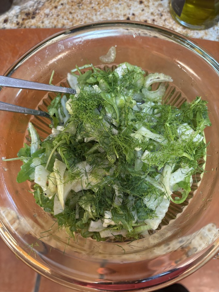 Arugula Fennel Salad, author Anna Gershenson (apologies to the author for adjustments I’ve made). Make the dressing by combining ½ tsp toasted and ground fennel seeds, 1 medium garlic clove, grated, ½ tsp salt and pepper, each, and 2 tbsp fresh lemon juice. Let sit for about 10 minutes, then gradually whisk in 4 tbsp olive oil, set aside.