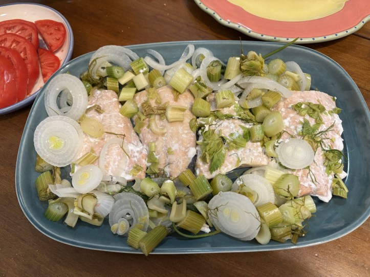 Note: What to do with the leftover fennel fronds. For our second night dinner, I topped several salmon fillets with the fronds, thinly sliced onion, and one stalk of celery, chopped. Added about one cup of white wine and gently poached for about 10 minutes. A light, aromatic dinner.