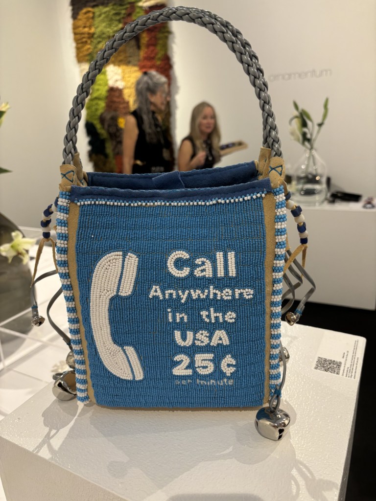 Bobby Dues is also a comedian and his humor mixes with traditional Native American beadwork to offer “social commentary on the generic … landscapes of the USA.”