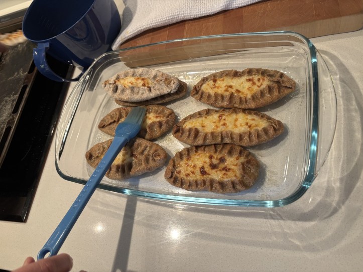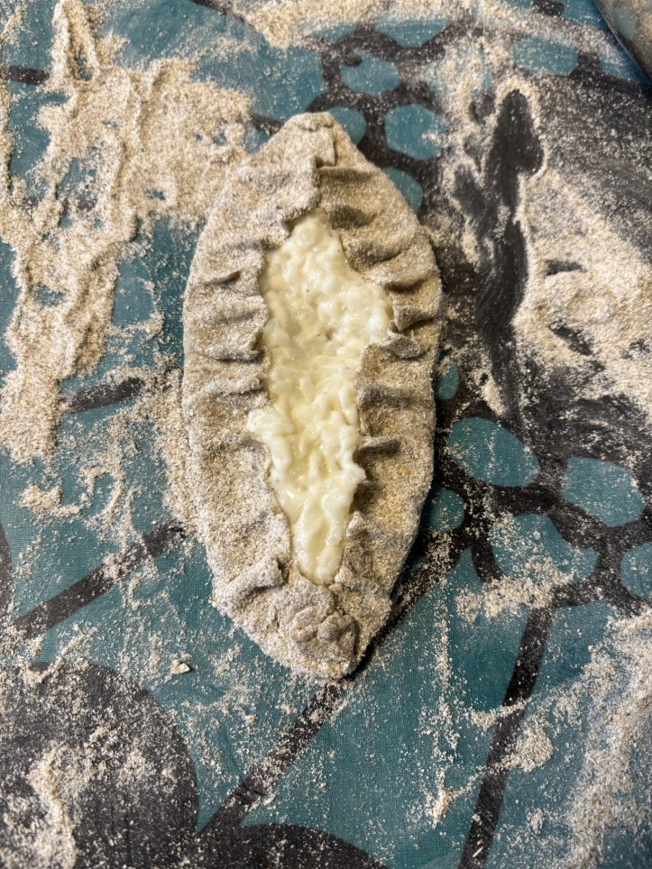Next was assembling the simply dough using rye and wheat flour. And rolling out each little pastry shell. Each was filled with a good spoonful of porridge, then the edges crimped to make the proper form and into the oven for the allotted time.