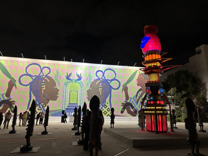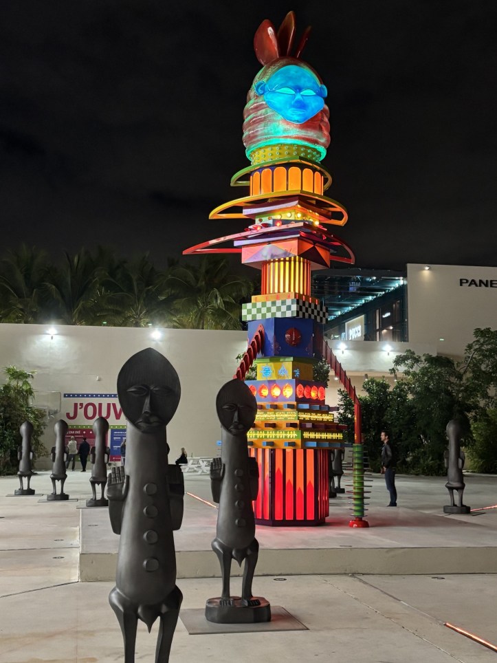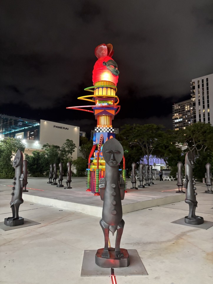 Last year, the Miami Design District hosted Marta Minujín’s inflatable Dreamscape sculpture in their Jungle Plaza (see April 2, 2025 post). This year J’OUVERT by British-Trinidadian artist Zak Ové again transformed Jungle Plaza into an immersive environment filled with Afrofuturist imagination for a few short weeks. On display were two of Ové’s significant monumental works, The Mothership Connection and The Invisible Man and the Masque of Blackness.