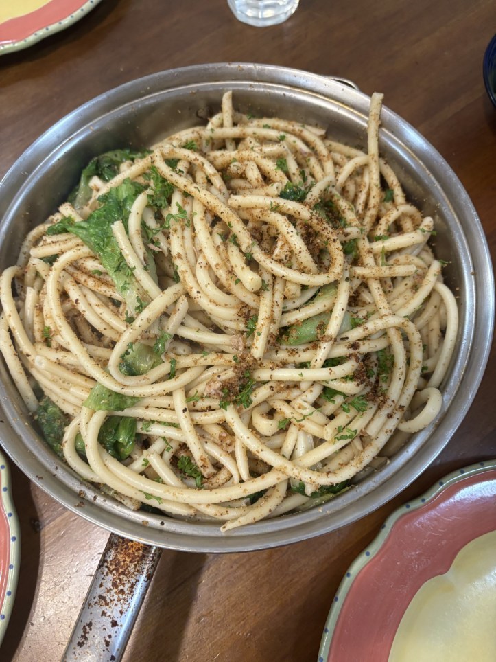 Pasta with sardines,* breadcrumbs, and capers (and escarole). This recipe calls for ½ cup of breadcrumbs that are gently toasted in a large skillet and removed. The escarole is blanched; then one pound of pasta is prepared as per instructions in the kale water. Next, one can of chopped anchovies, one sliced onion, 5 sliced of garlic cloves are sauteed in the skillet for about five minutes. Two cans of sardines are broken up and are added to this mix along with 2 tablespoons of capers, the zest of one lemon, and 1 tablespoon of paprika, smoked or sweet. After about another five minutes, add the cooked drained pasta, blanched escarole, toasted breadcrumbs, and ½ cup of chopped parsley along with about ¼ cup of the pasta water. Toss well to mix all the ingredients. We enjoyed this meal with a tossed salad on the side.